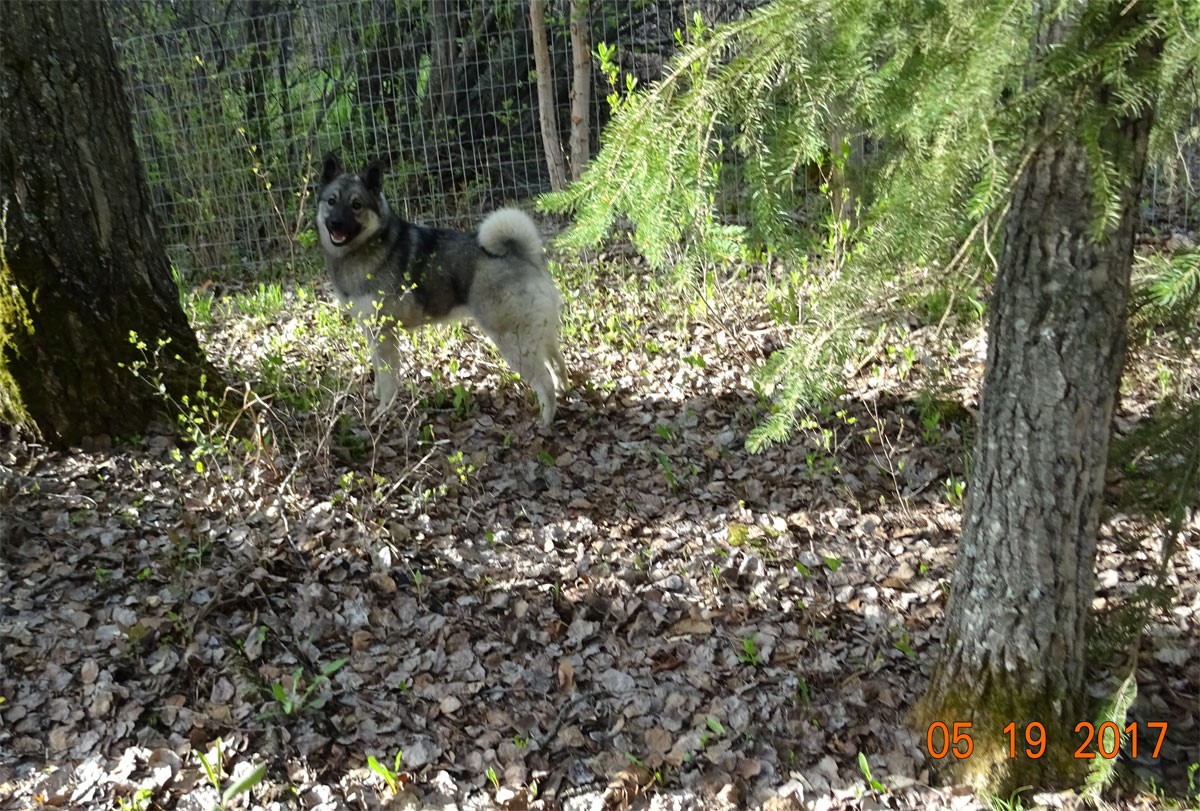 Jaegar is shown here in November of 2013 at our new home. This is an oustanding male Elkhound, he is a large and solid 70 plus pounds. You can look for a lifetime to find a male like Jaegar.