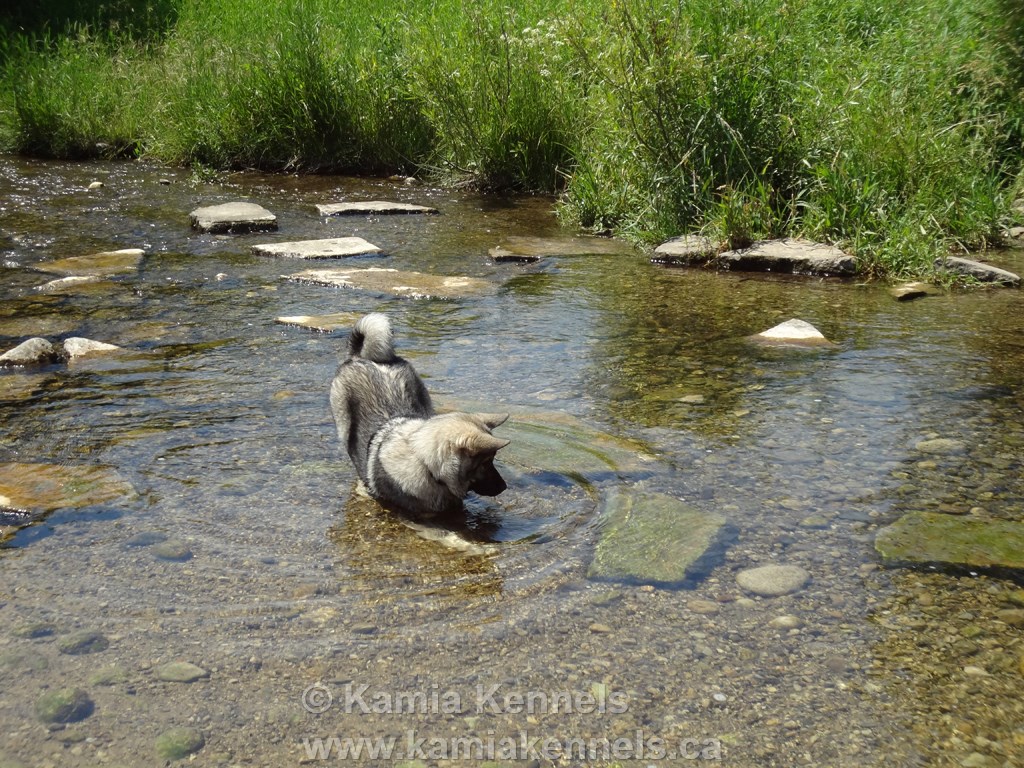 Jaegar has the tendency to love water. Some Elkhounds like water, some don't. Jaegar is one of those who just loves the water. He is playing in it, laying in it, cooling off in the summer, chasing sticks, and water droplets and splashing around. Ashten says if he can find a pool, a stream, a creek he is making a beeline for it.