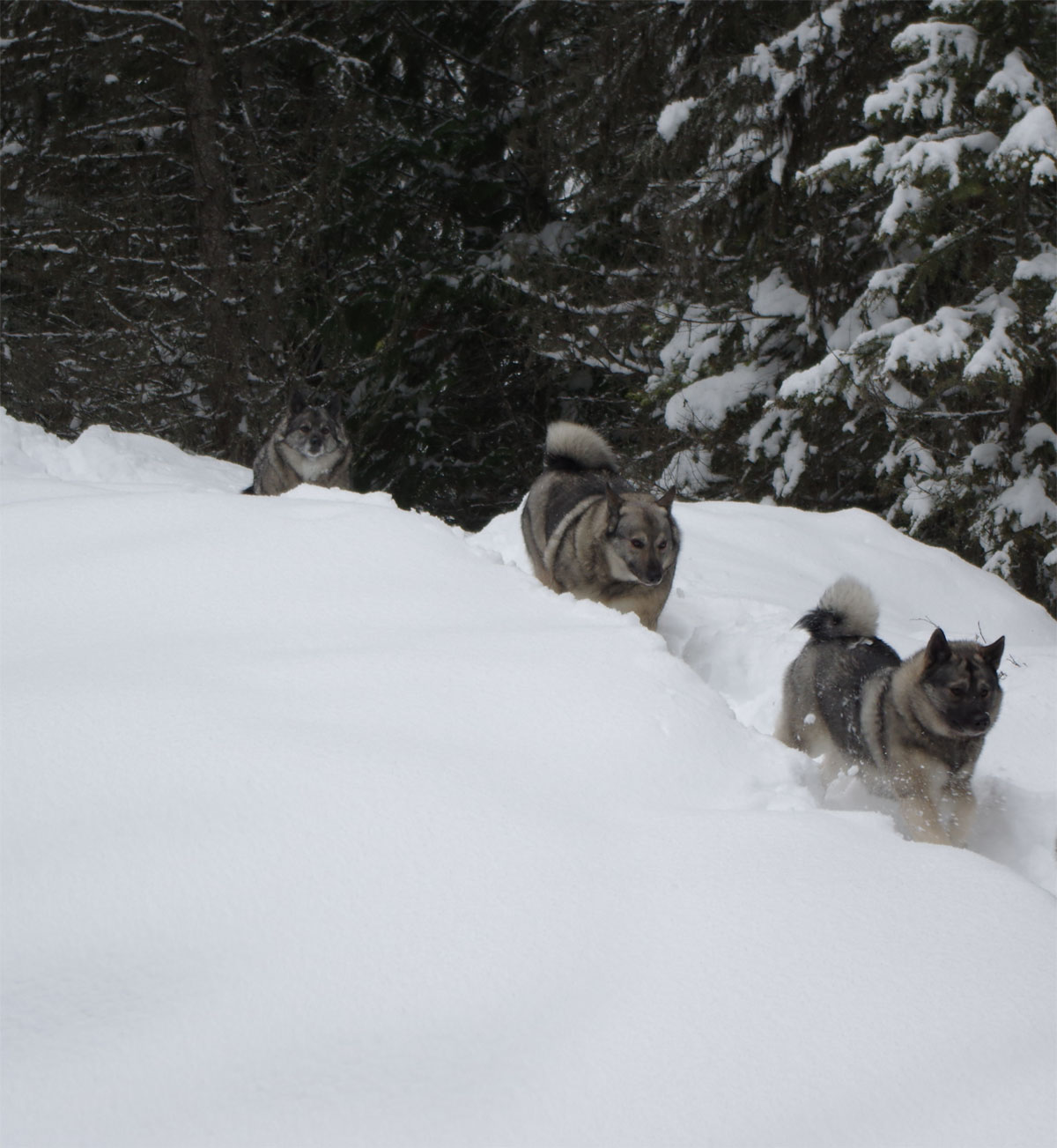 Kai's ancestors a few generations back of course are a very capable and rugged set of dogs, all true hunting dogs, and many Champion hunting dogs. The big fella to the left is Kjekk, a Champion hunting Norwegian Male over in Norway. Her ancestors are true working dogs, they range, hike, hunt and protect. Yet they can win show after show as well. Kjekk is a perfect example of a working Norwegian Elkhound male in his element.