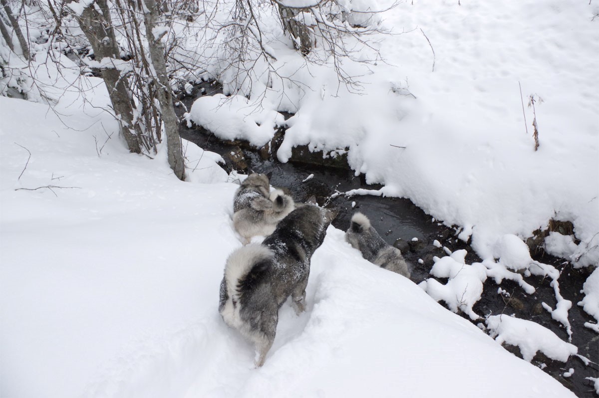 That description I read about crossing frozen creeks has kept running through my mind many times over the years since we moved here. We have a creek on our property and the dogs and I we hike down to it a fair bit. It's a fun hike for us and it's always very scenic. I decided to use the creek story to talk about two of our magnificent Elkhound Males, Leif and Jaegar.