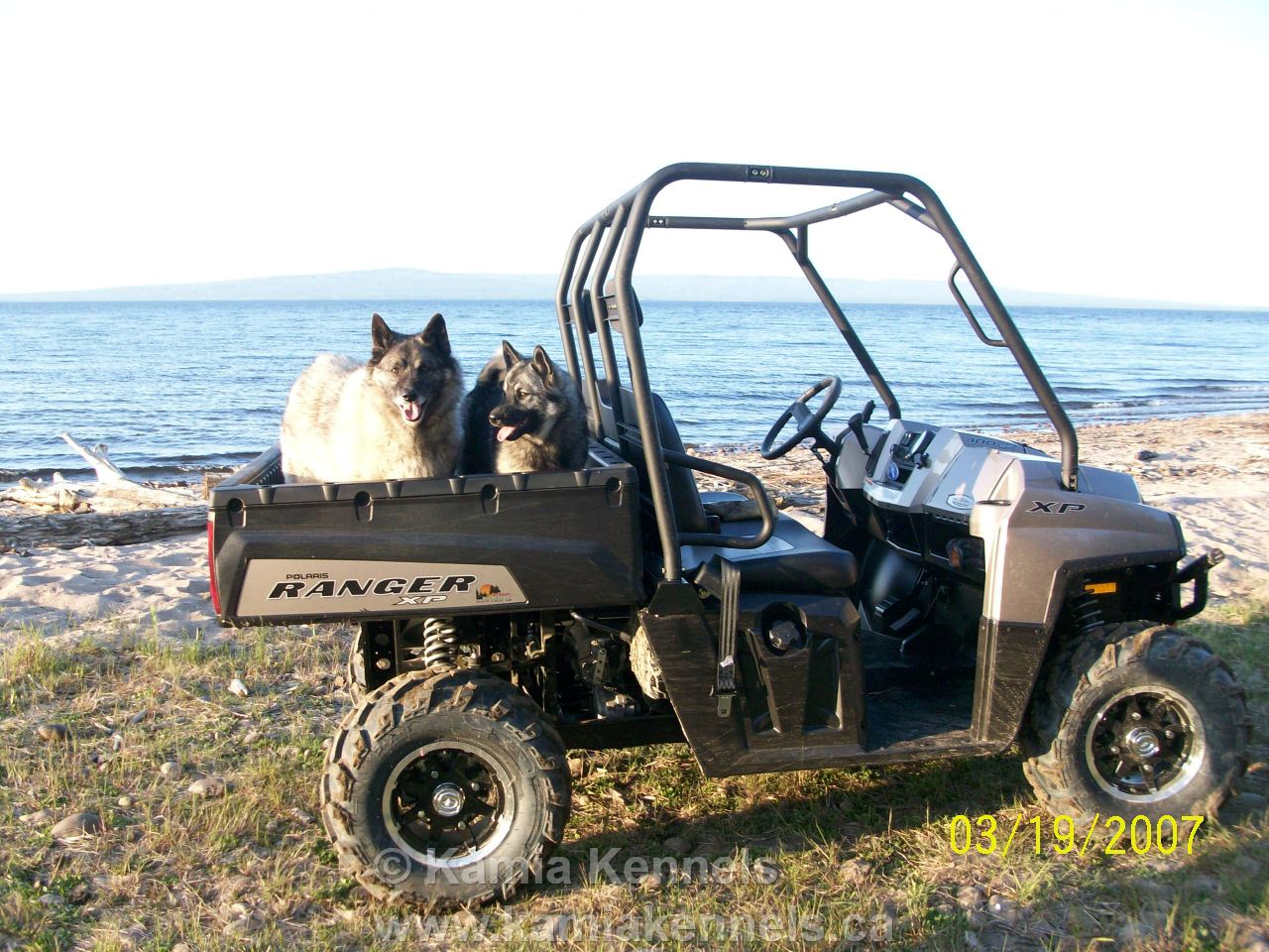 Lawrence has found a new system for traveling around Northern Alberta with his two Elkhounds, Kelsey and Lexi, I need to find out what he is doing as I would like one of these new Ranger outfits as well. Here is a great photo of the Lake with the dogs enjoying the new ride.