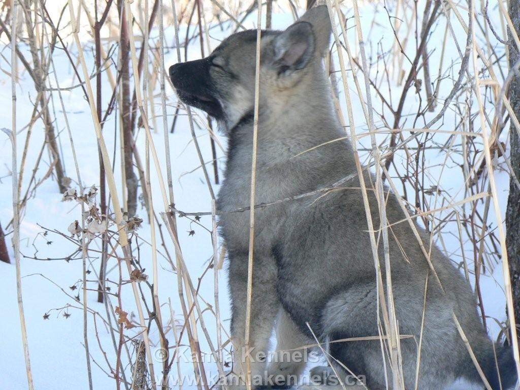 The owners of Loki, a powerful young male Elkhound have recently sent us some photos, thank you, Dorothy and Dan for touching base with us and sending these photos. You have a great young male Elkhound, and looks like he has it made up in Northern Alberta.