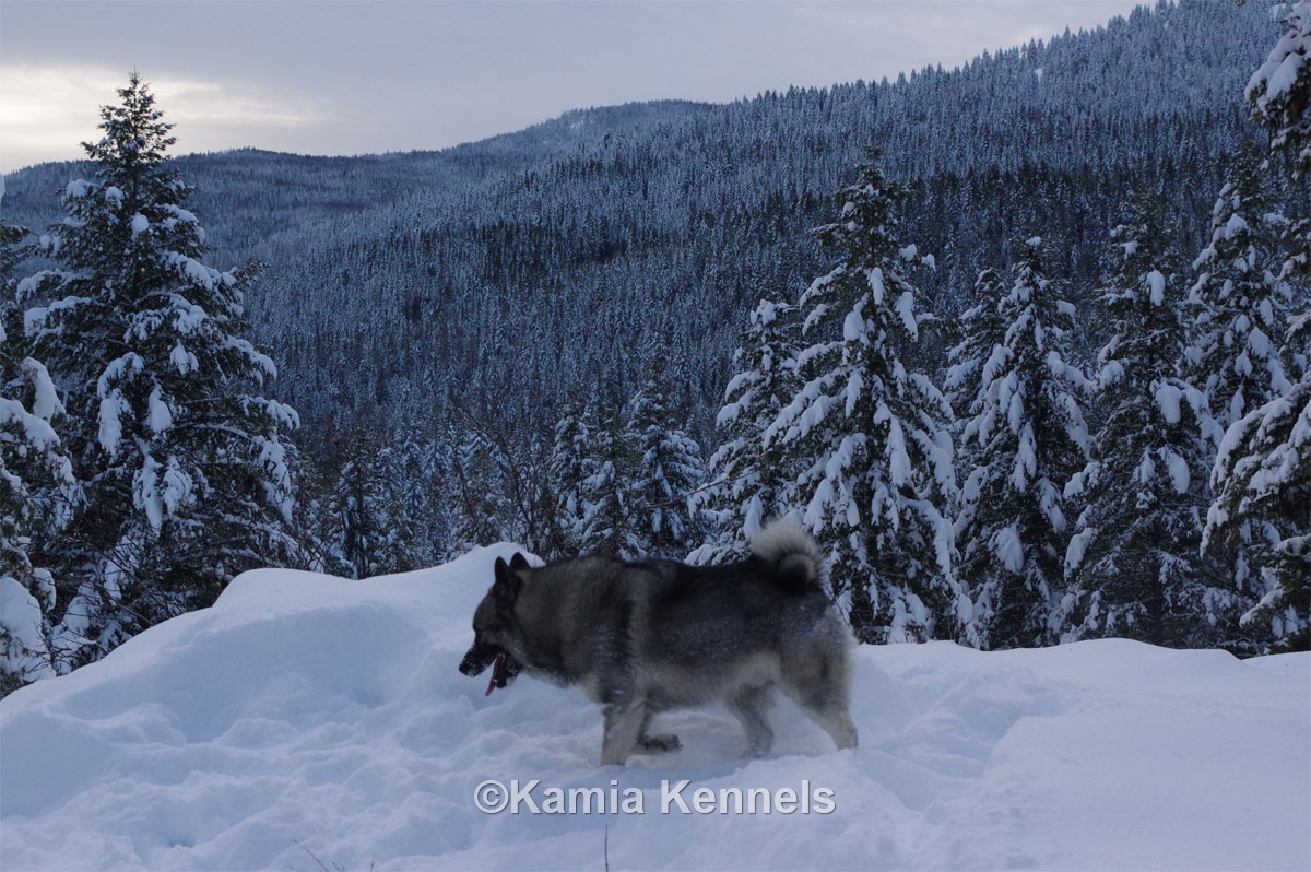 She is shown here with me on a winter hike, it's cold out, snowing, tons of snow already, she just loved it. Kamp and I went everywhere off leash. She was a full GQ female, but loved the remote regions like no other.