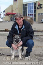 It was a great afternoon for a visit with Cathy Arbeau and Shadow in Red Deer on April 4th, 2009. Cathy had called and asked if we would like to meet with her and Shadow at the Alberta Sports Hall of Fame as they were traveling down from Edmonton. We were excited to go in and visit and see how Shadow was growing and developing. Wow, what a beautiful young male. He had always been a very sharp young male as a pup but we had not really seen much of him for the last 4 months or so since she had took him home, what a difference that little bit of time makes.