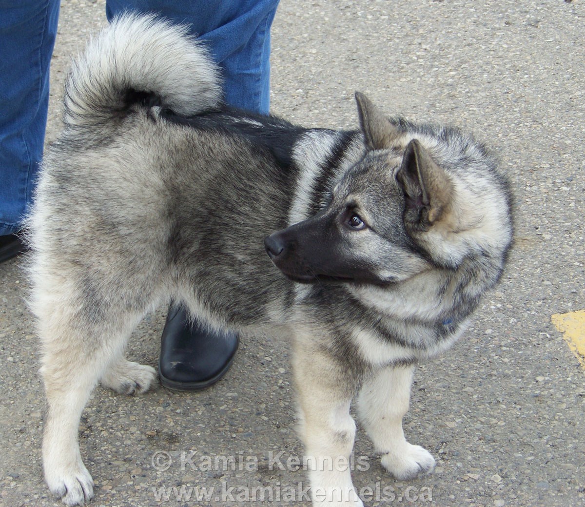 "We couldn't believe how he had grown - Shadow has really grown since we saw him last, he is 24lbs in these photo's and he is a solid young male Norwegian Elkhound. He is wide and his stance is very stable, he has a great set of paws and he moves very nice. His tail has a great curl and he is alert and bright. He is very much like his brother Koda when they look at you, they really pay attention and look right at you, so attentive and ready to do what you ask. He has a full black muzzle and it tapers evenly and his ears are well pointed and alert.