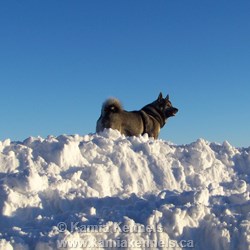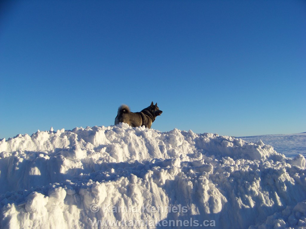 The coat of the big dark grey's like Takoda are magnificent, this is his everyday attire. He has had three brushings in his life. We brush him in the spring. Period. The outer guard hairs on the Swedish Elkhounds are black tipped, with a longer black tip, also a more even black throughout, not so grey as the Norwegian types. This is a characteristic of the Swedish types along with the cream chest and belly, and lighter throat and lower jaw. The black masks are not normally found in the Swedish types but in the Norwegians. The tail is curled but not wrapped as tight as the Norwegian type. Often times carried slightly to the side as well. The ears should be upright and should have plenty of cover inside for warmth. These are double coat dogs, so handle extreme cold temperatures well.