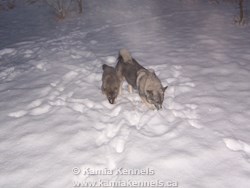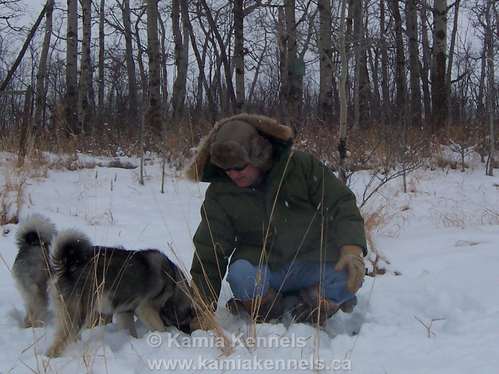 The winter hikes are exciting for me, I like to watch the movement, the ranging, how the dogs work. I can't really see it well in the summer, so the winter hikes are perfect. Takoda, or any of the Elkhounds, once we hit the bush, it's work time, any season. They have a job in their mind to do, so it's neat for me as I can find a higher location and basically watch. Takoda will range all around me, constantly checking, looking and making sure he knows where I am and just keeps doing this. We can be out for 7 hours right almost till dark, same thing is going on the entire time.