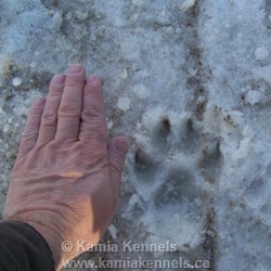 A large Timber Wolf passed through our turf a couple nights ago, Takoda and I went out for a hike and he was immediately checking out the tracks. Takoda's paw print is the little dark brown one in front of the Wolf Print, just to the upper left of his paw, look at the difference in size. The Wolf tracks were way deeper, he would have been in the 200 lb range, sinking in twice to three times what Takoda sinks in.