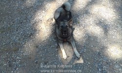 She has a beautiful coat, her mask is deep black, with deep black ears. She is a very proud confident female, no one is pushing her around, yet she is not aggressive or confrontational in the least, very stable, yet has that air about her, it comes from being a lone pup partially, she has always been "the boss" so to speak. Her lineage though speaks to confidence so the stability of the pups from this pair will be outstanding.