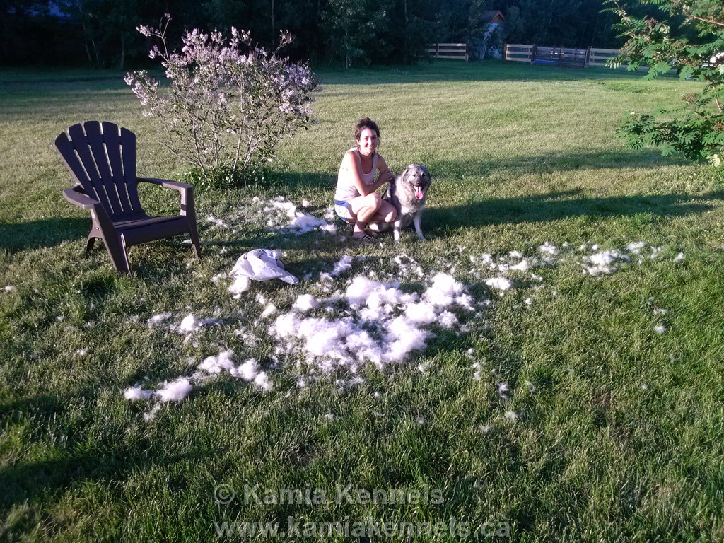 But, as any Elkhound owner will tell you, it's not exactly all fun and games, you do have to brush these big fellas out a couple times, and when I say brush them out, I am not kidding. A big Male like Jaegar, well I could knit a toque in one year, and mitts the next just from the inner coat that they blow off.