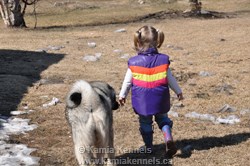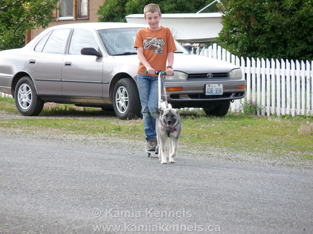 Freyja is a great female from Tora, second Litter, and is a granddaughter of Mia, no wonder she stood her ground with that Lab, no offence to be intended to Labs, but Mia she don't like labs, so no doubt, neither does Tora, and well, we know there is no love lost with Freyja and labs. Check out that new sport "Scooguring", neat Brennan! These are working girls, they don't mind in fact actually love the harness. Just ask Brett and Shelly up in the Yukon with Freyja's aunts, Kari and Nika. A big thanks to Amber for keeping us posted, we sure do appreciate it. She is having a great time.