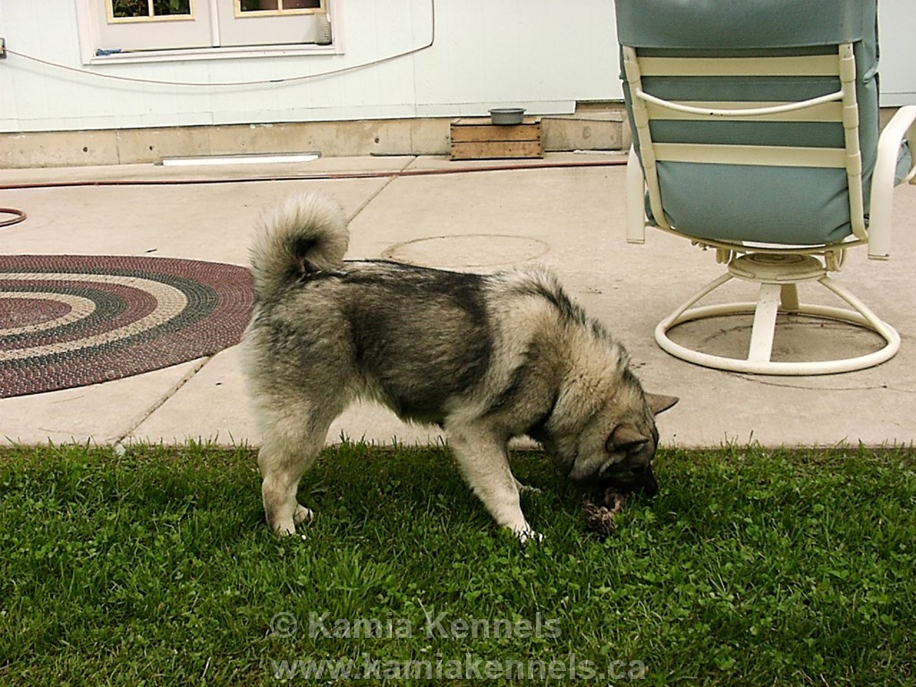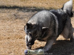 Jaegar has lots of great qualities but one of his features that is not so readily visible is his incredible bite strength. We feed raw and raw fed dogs are very healthy, have no loss of development in bone structure or density, or strength, particularly in bite strength. Jaegar brings the big old powerful jaws and muzzle of the ancient dogs to this pair, there would be few Elkhounds that would compare with his power.