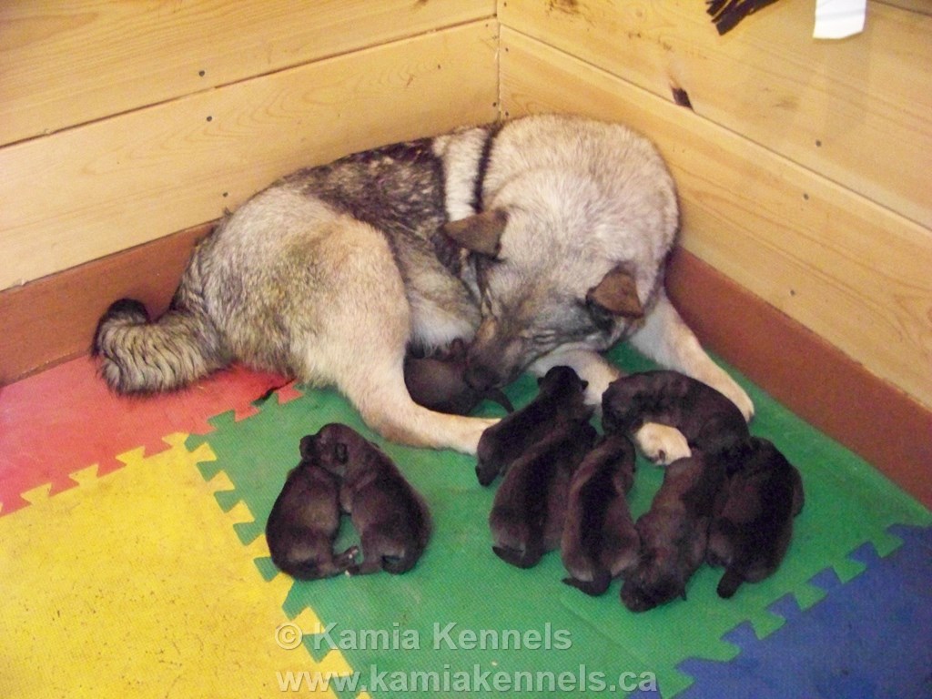 On the day and evening of July 25th, 2012 Tora had her third litter, a magnificent set of 8 big boys and 1 female, a tough little rascal she is. They are all doing very well, already they have big fat bellies and this photo is the next day. It will be some noisy around the 6 week mark with 8 boys, good gracious, I though last time was noisy.