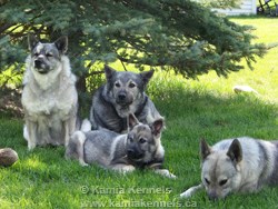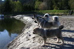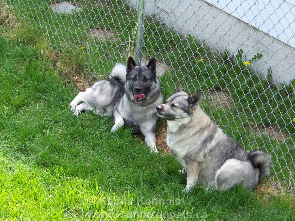 David and Colleen have been keeping me posted on how Kate is doing, and believe me, she has it made. She is living in paradise, protected and watched over by two beautiful Elkhound females, her new best pals, and playing in the sand and sleeping under the stars in the Shuswap, life for a young Elkhound couldn't get much better. Kate is a female from Tora and Bram, an outstanding pair, and as you can see, she better come each day in her best dress as those two girls, Lisa and Suzie are prize winning Elkhounds, this is the everyday attire for them.