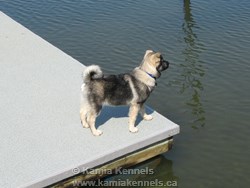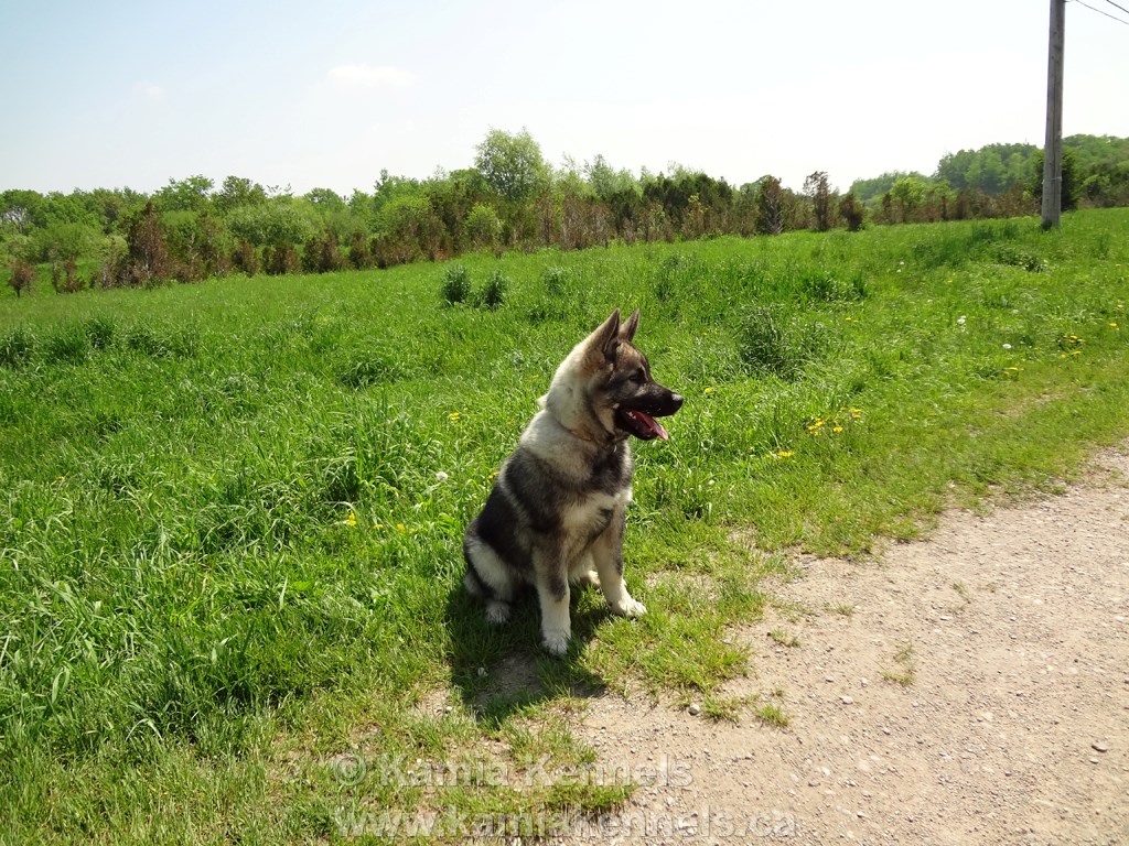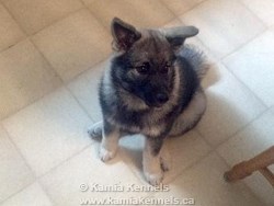 "Things here have been awesome, Torsten is great, house trained when he came. Full of energy and life. He's been playing hard at the farm with Max, and everyone loves him. Slowly working on obedience , he has sit and stay down pat, but come here is going slowly. Been feeding him dry and raw beef, fish and chicken. Fishing season starts on the 15th so will see how the maiden voyage with him goes, been slowly working on him to get use to the water. He's going to be a handsome Elkhound, he's already guarding the house and lets us know when people come around also holding his own when playing with the huskies. Where so happy we got him, and you picked out the perfect pup for us thank you.