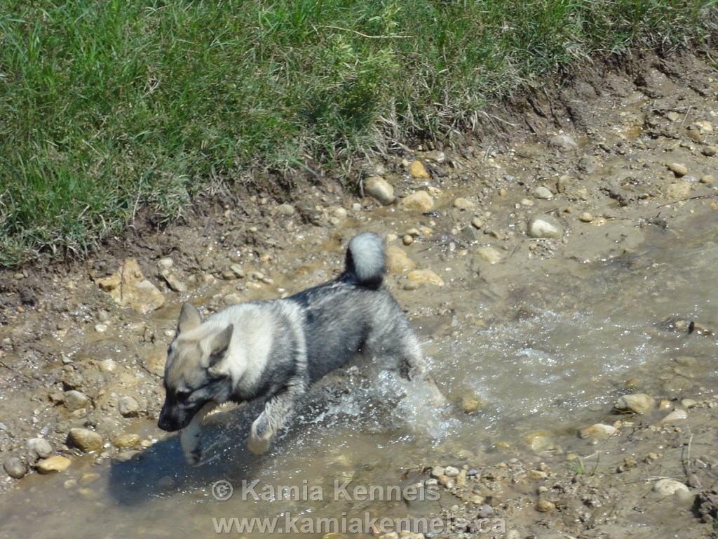Even though I am biased as you know, it would be a ton of traveling and searching to find a better male than Jaegar. Our daughter's best buddy Jeagar, is out of Takoda and Mia, brother to Shasta and Tesla. It's hot in Ontario and Jaegar is always burning around in the streams to cool down. Ashten was able to get these photos at the end of May, Jaegar was born February 12th. He is a big boy, strong and with a powerful frame shaping up. Jaegar, as does Tesla, brings all the old world Swedish traits forward with him, some old stories say the history could be 9000 years old this breed, with lot's of archaeological and other data easily going back 4000 - 6000 years. Jaegar is pretty much unchanged from them old boys of ancient times.