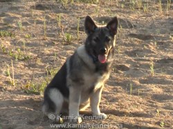 When you hear the old stories of how the Elkhounds cleared the Scandinavian regions of the wolves, it was males like Jaegar these tales speak of. Solid, muscular dogs, pound for pound able to stand with any, hard working, loyal dogs, one owner dogs. Dogs like Jeager are the old Viking dogs, traveling and hunting with their owners, used to bring home the food, provide companionship, chase off the odd bear. In modern times, it's dogs like Jaegar that provide that loyal friendship for young ladies a long way from home, a link to familiar home life in a busy place, and as he grows, a true companion, pal and protector.
