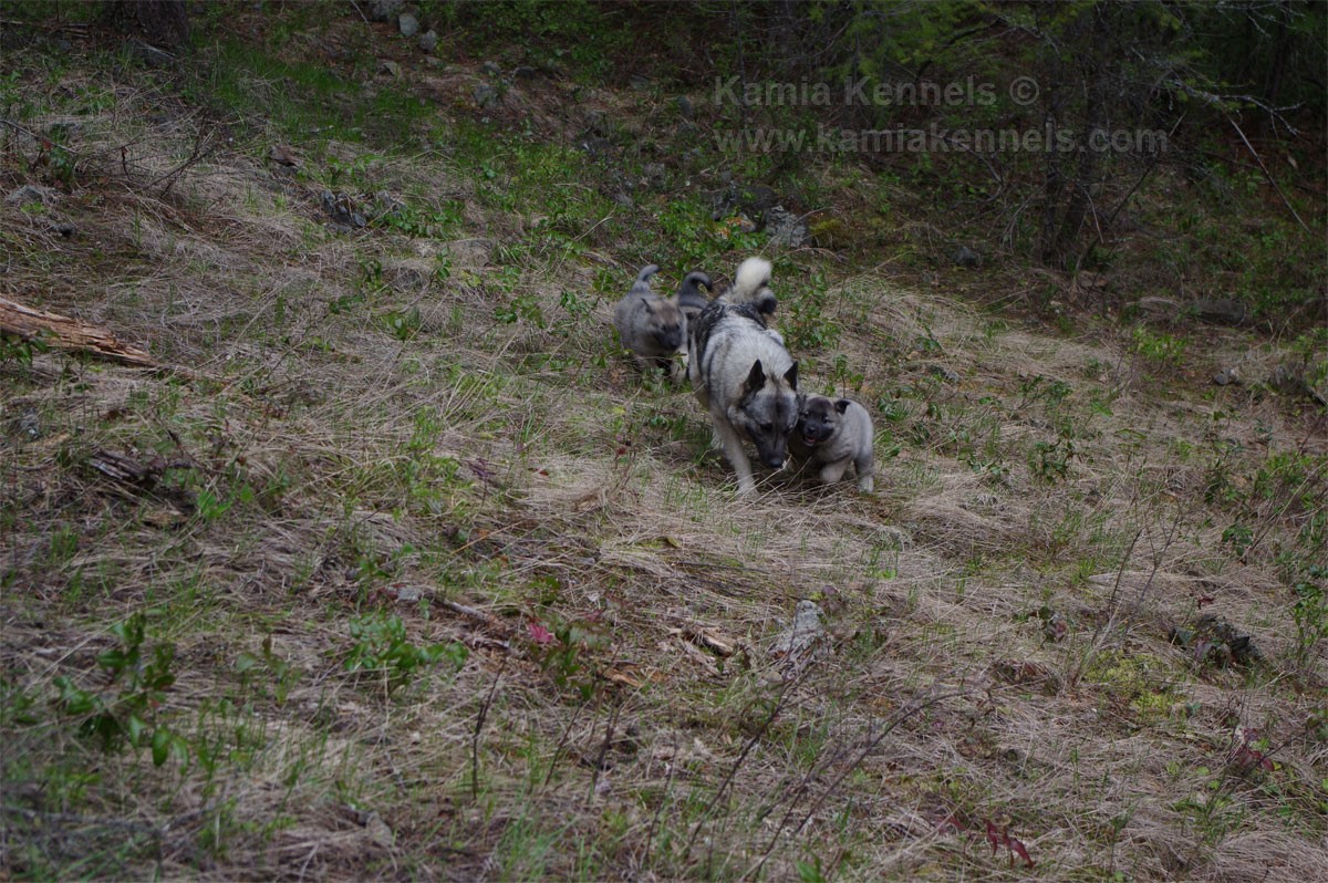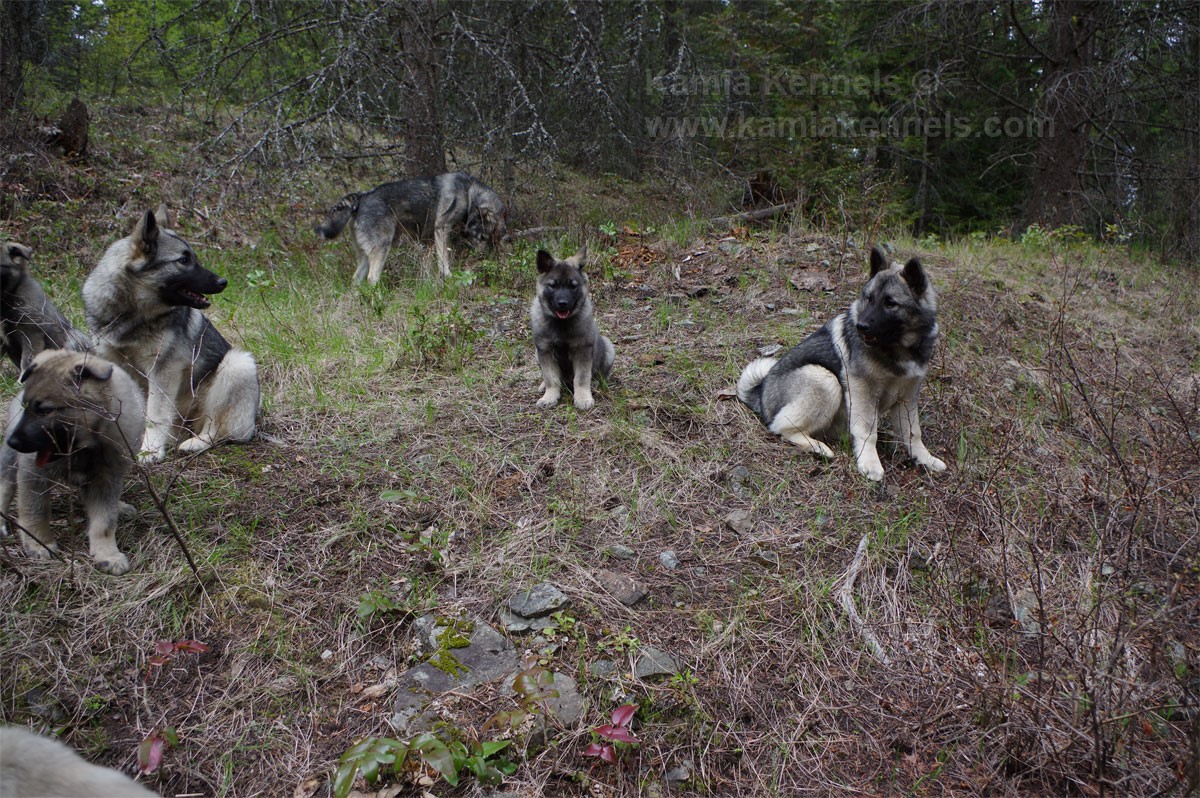 hiking dogs, pack oriented Elkhounds all surrounding the pups leads
