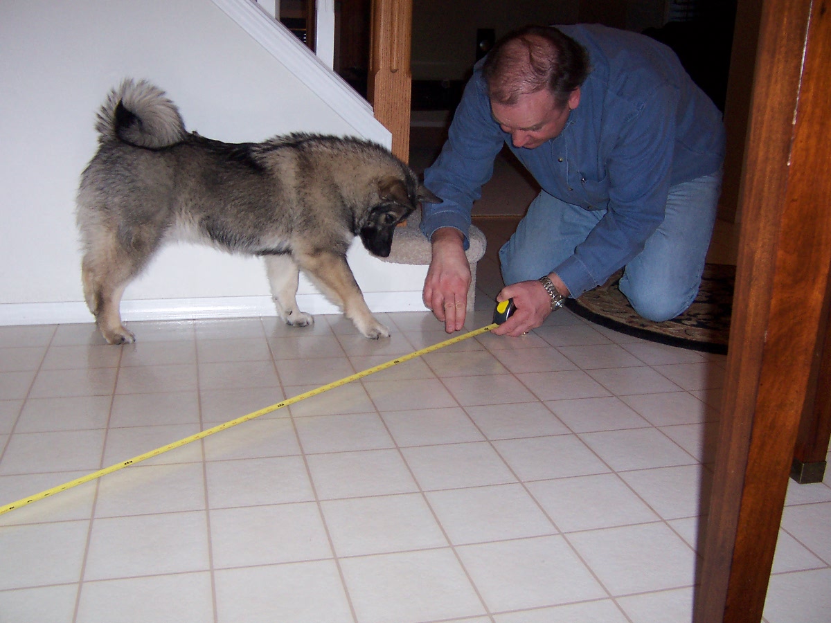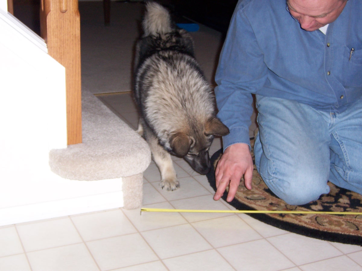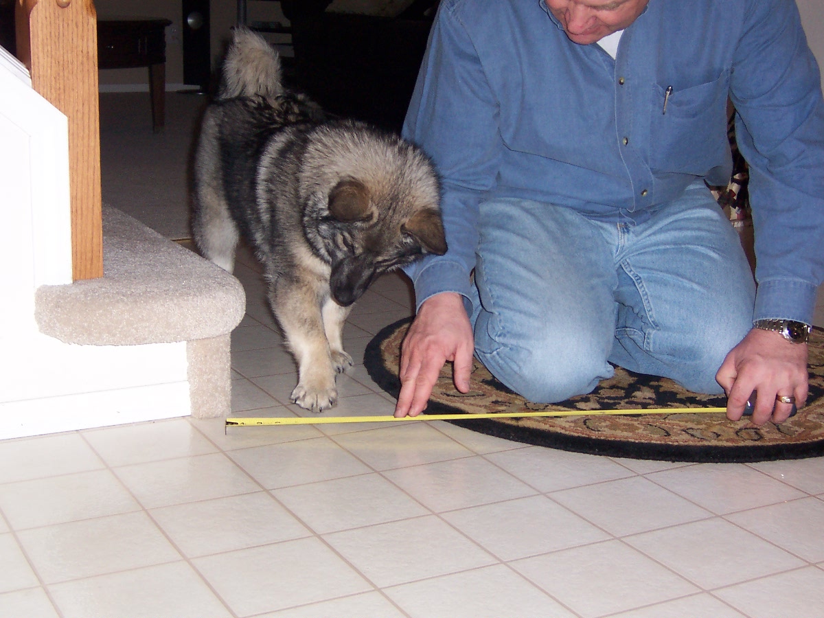 I probably don't talk about it enough, but the ancient Elkhounds have been around wood and woodworking, lumber, logging and forest for every bit as long as they have been around Moose and Moose hunting. Even though they are super well known as the Moose Dog, every Scandinavian worked in the woods and with wood with his Elkhound. They are so in tune with wood, sawdust, working with it, any type of carpenter work. I am getting set to replace the flooring with a more suitable hardwood floor in these images below. Mia is right on board with that, out with this vinyl she says. I swear, she was able to read the tape, that's how smart she was! I was talking with her, showing her the tape, saying look here, see this, she is like you mean here? I told her go check that measurement, she goes down there, takes a look, comes back, says, you have to cut here, and puts her foot on the mark. Too Funny. I say, okay, we are good to go, gimme five!