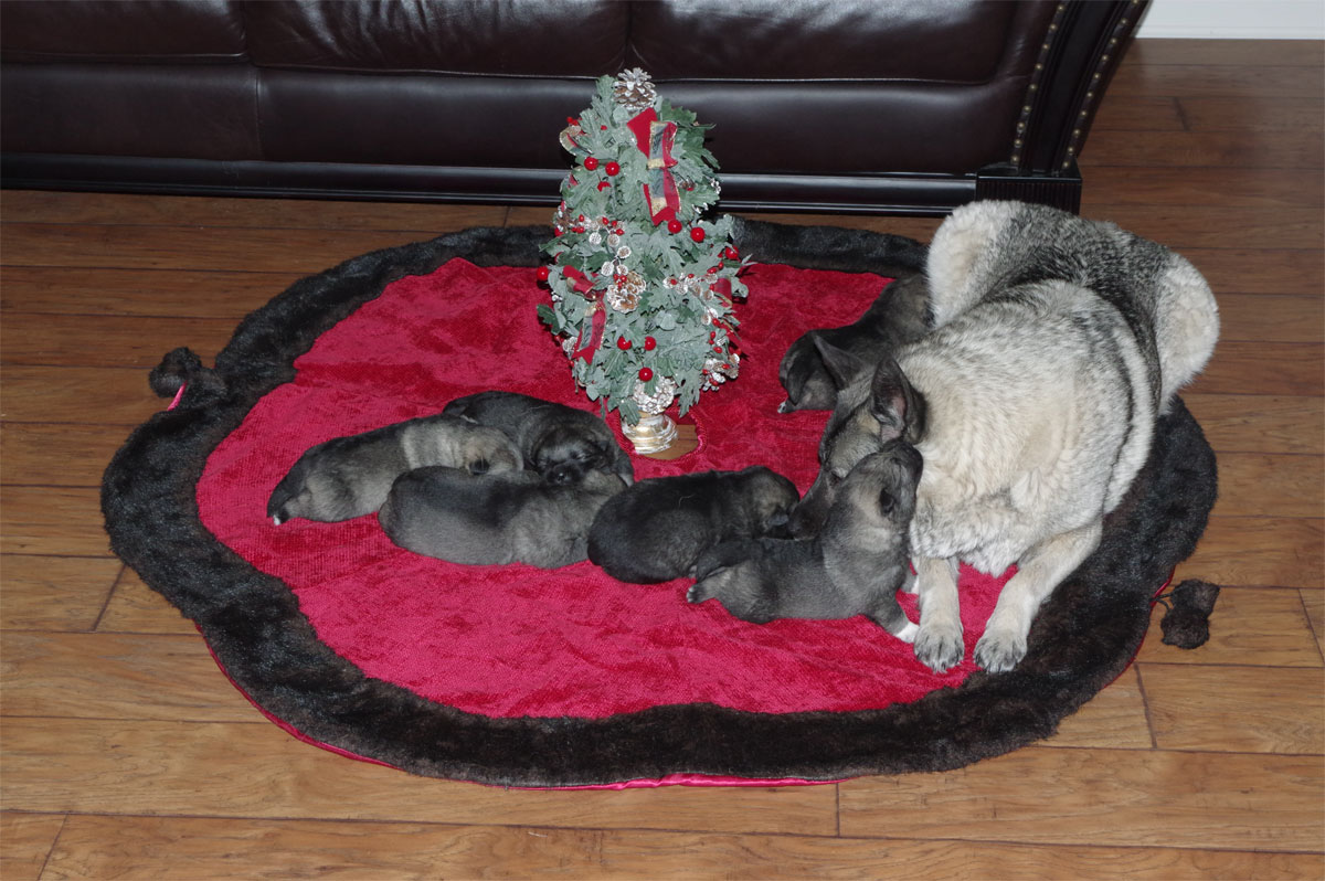 It's pretty neat for me that on the xmas tree rug in the living room last night while I am writing this December 21, 2015, I put 3 Grandsons and 3 Granddaughters of Mia on it around a little Xmas tree. Her old friend GAEDA had one last gesture of respect for her, she brought out a few little white feet rascals along with her usual black footed fatsos. Good for her. It's fitting that GAEDA and Jaegar are the pair to have the first new set of Grand pups since she has been gone. I am very happy for GAEDA and Jaegar.