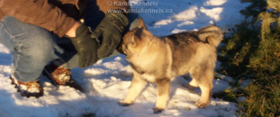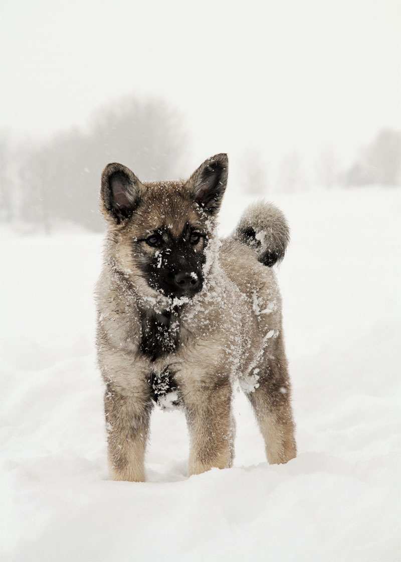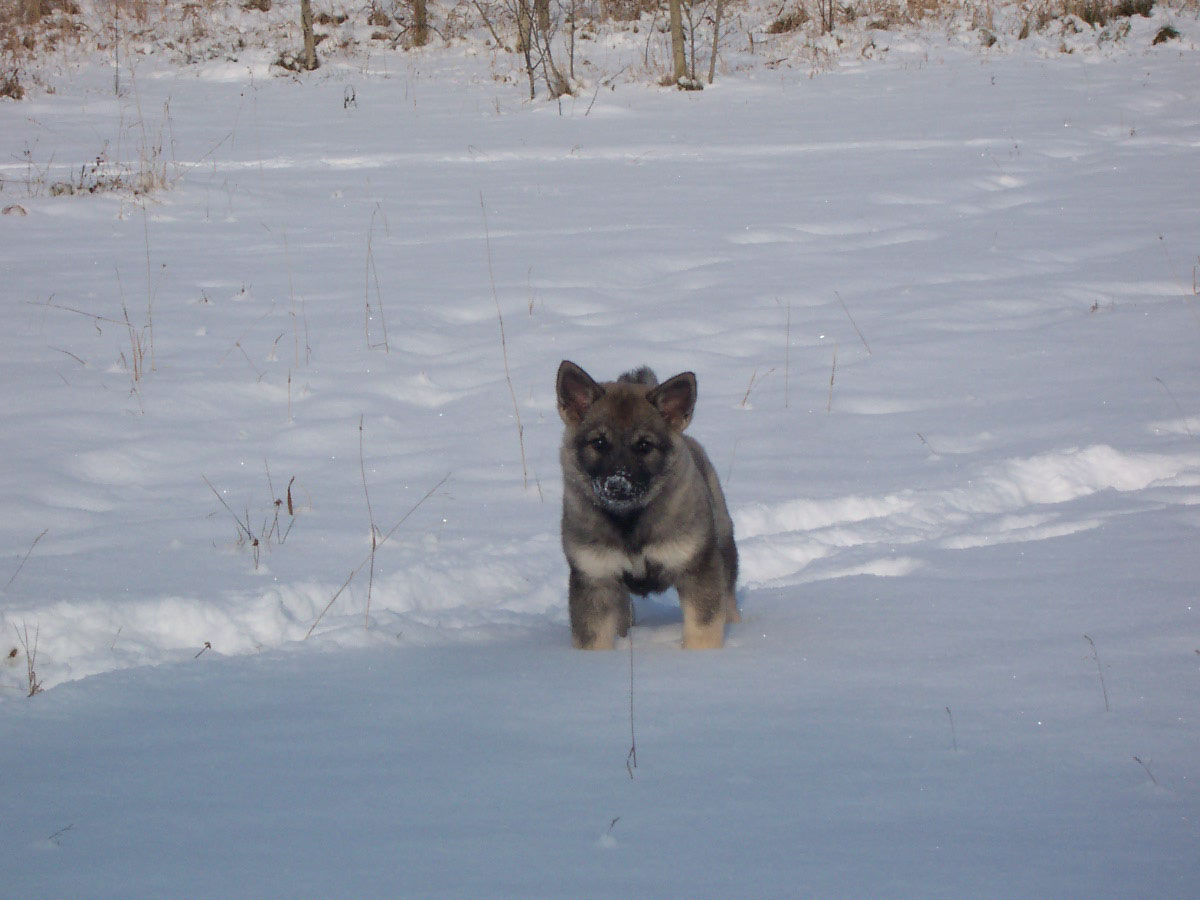 From day one we knew we had a fabulous Norwegian Elkhound female. She was a snow dog extraordinaire. She loved the snow and was a snow jumping rascal if there ever was one. We couldn't get her to come in. Tough as nails, handled the cold like you wouldn't believe. Always was outside.
