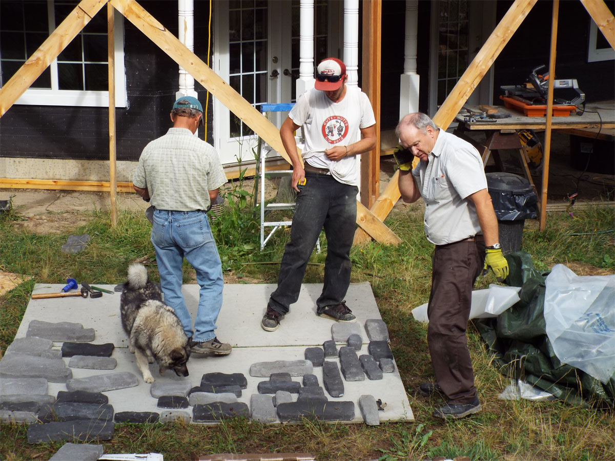 she was there.to the left: Many years later when we moved here, tons of work to do, she worked side by side with me - here she is right involved in helping to select the rocks in the right order for the rock work, as a coastal Elkhound, she knew rocks. My cousin Phillip came out to assist Duke and I to get a great start, and Mia was happy to be involved. She was always a part of our construction.